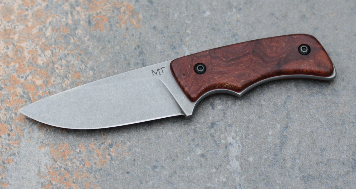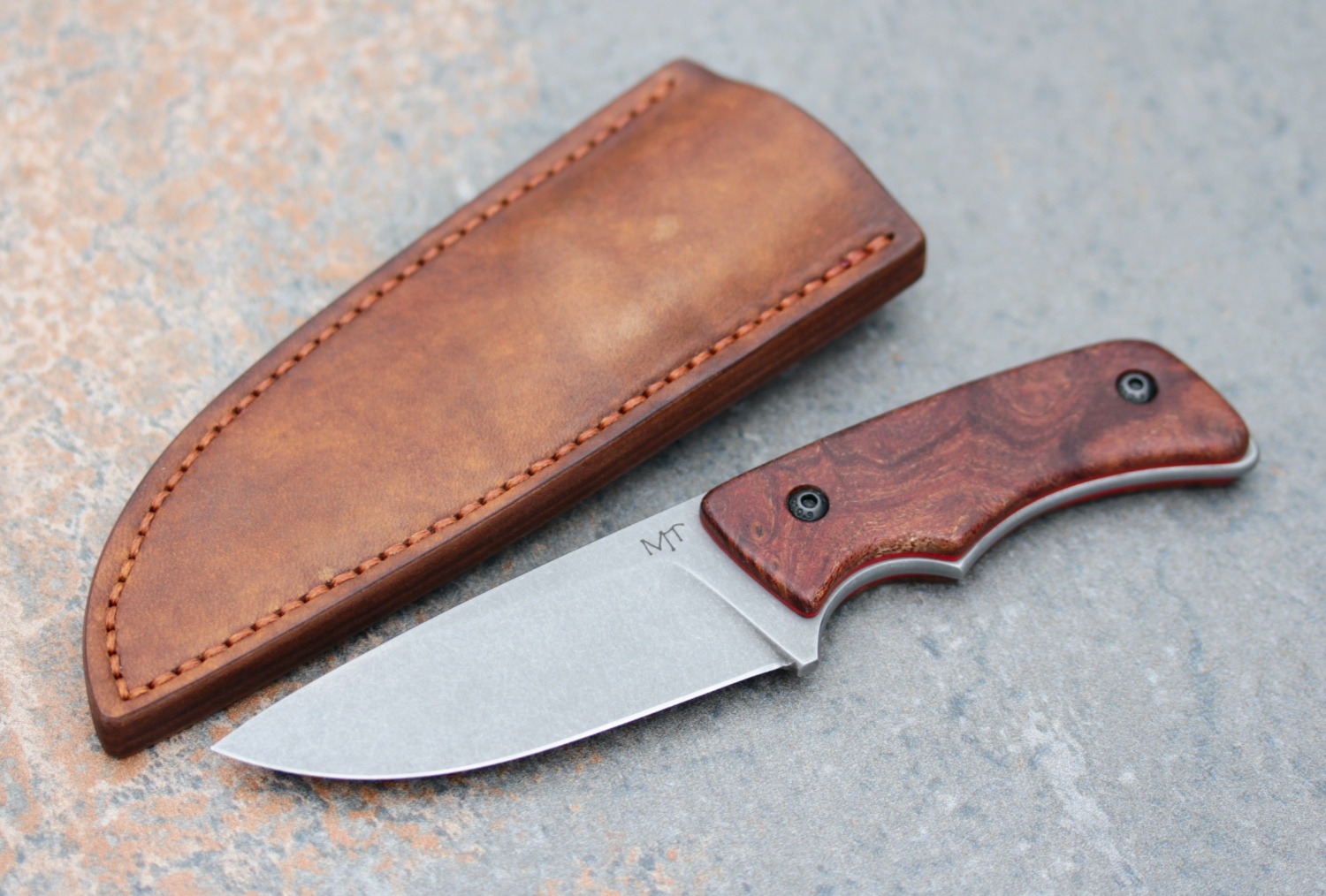 Dieses EDC Knife (EDC = every day carry) passt in jede Tasche bzw. jeden Rucksack. Der Stahl lässt sich sehr gut schärfen, ist aber nicht rostfrei. Um die Klinge vor Oxidation zu schützen, habe ich die Oberfläche mit Eisen-3-Chlorid geätzt und dann ein Stone-washed-Finish gemacht. Lediglich die Schneide braucht hin und wieder mal einen tropfen Öl, und das Messer sollte nicht lange nass gelagert werden.