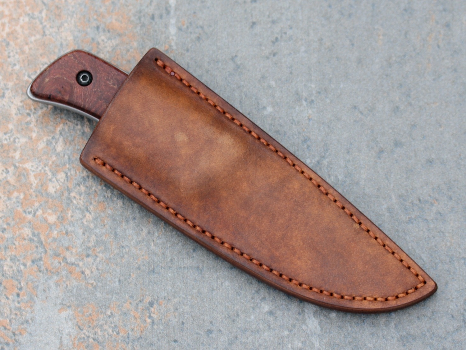 Die Lederscheide ist aus 3 mm starkem Rindsleder, was ein Tragen in der Hosentasche ungefährlich macht. Zudem ist das Leder nassgeformt und gehärtet, und das Messer wird sicher gehalten und kann nicht von allein herausrutschen.