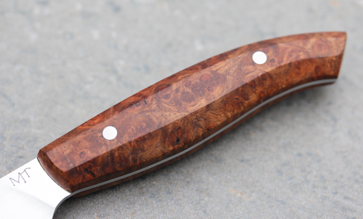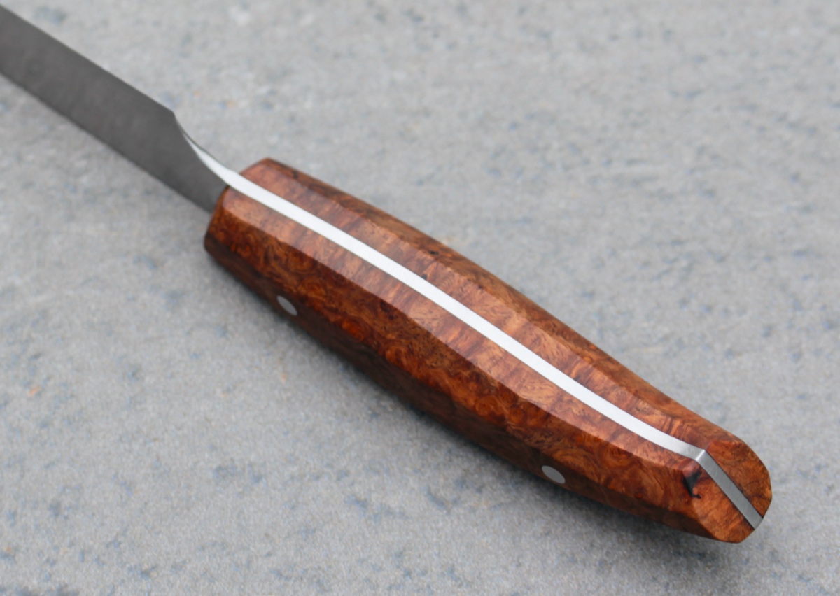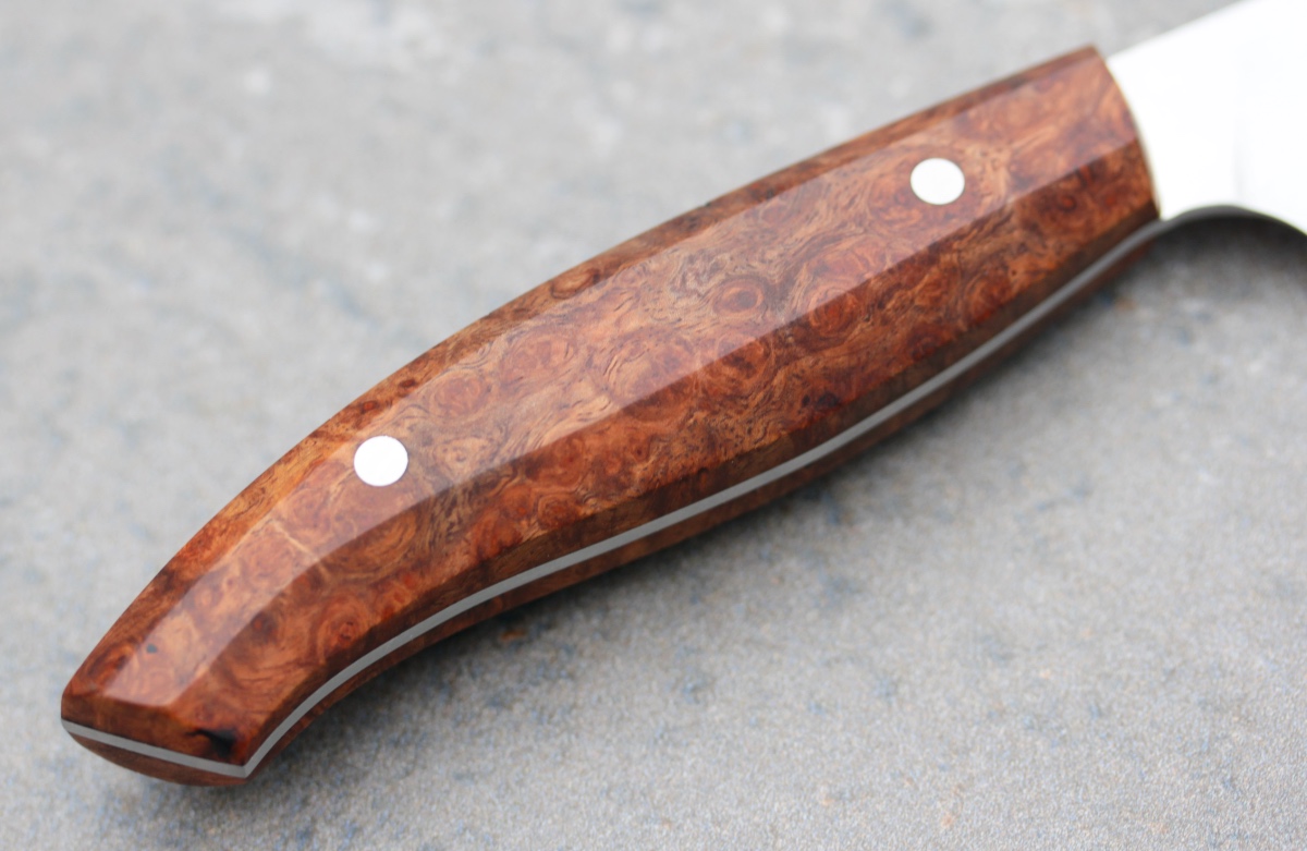 Dieses leichte und wendige Obstmesser hat einen Griff aus feingemasertem Amboina-Holz. Die Klinge ist aus rostfreiem 14C28N, dünn ausgeschliffen und mit 2 x 18 Grad sehr schneidfreudig. Es macht Spaß, damit einen Obst- oder Gemüsesalat zu schnibbeln.